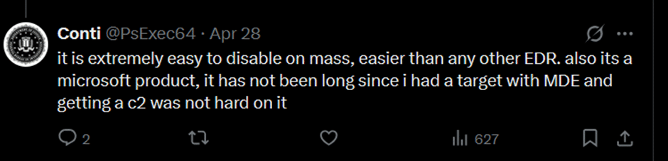 One surprise was the placement of Microsoft Defender for Endpoint (MDE) in the LOL Tier, sparking discussion among security professionals. While MDE has solid detection capabilities when properly configured, it’s likely that Conti’s low rating reflects how frequently they encounter it in default or poorly secured deployments. Many organizations rely on MDE out of the box without enabling its advanced protections, making it far easier for threat actors to evade — and justifying the “LOL” label in Conti’s eyes.
