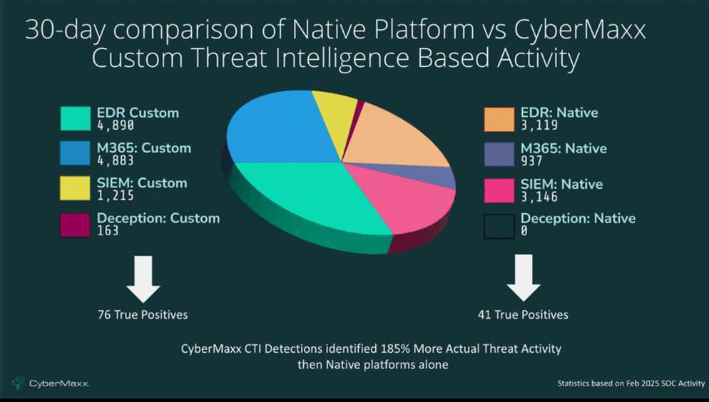 - CyberMaxx Detection Engineering for optimizing Native Detections, enhancing incident fidelity, avoiding alert fatigue for our clients, who otherwise would be responding to excessive false positive alerts, inherent with in-the-box Platform Native Detections, where we boast a handling rate of 99.99%. We at CyberMaxx do the work for you.