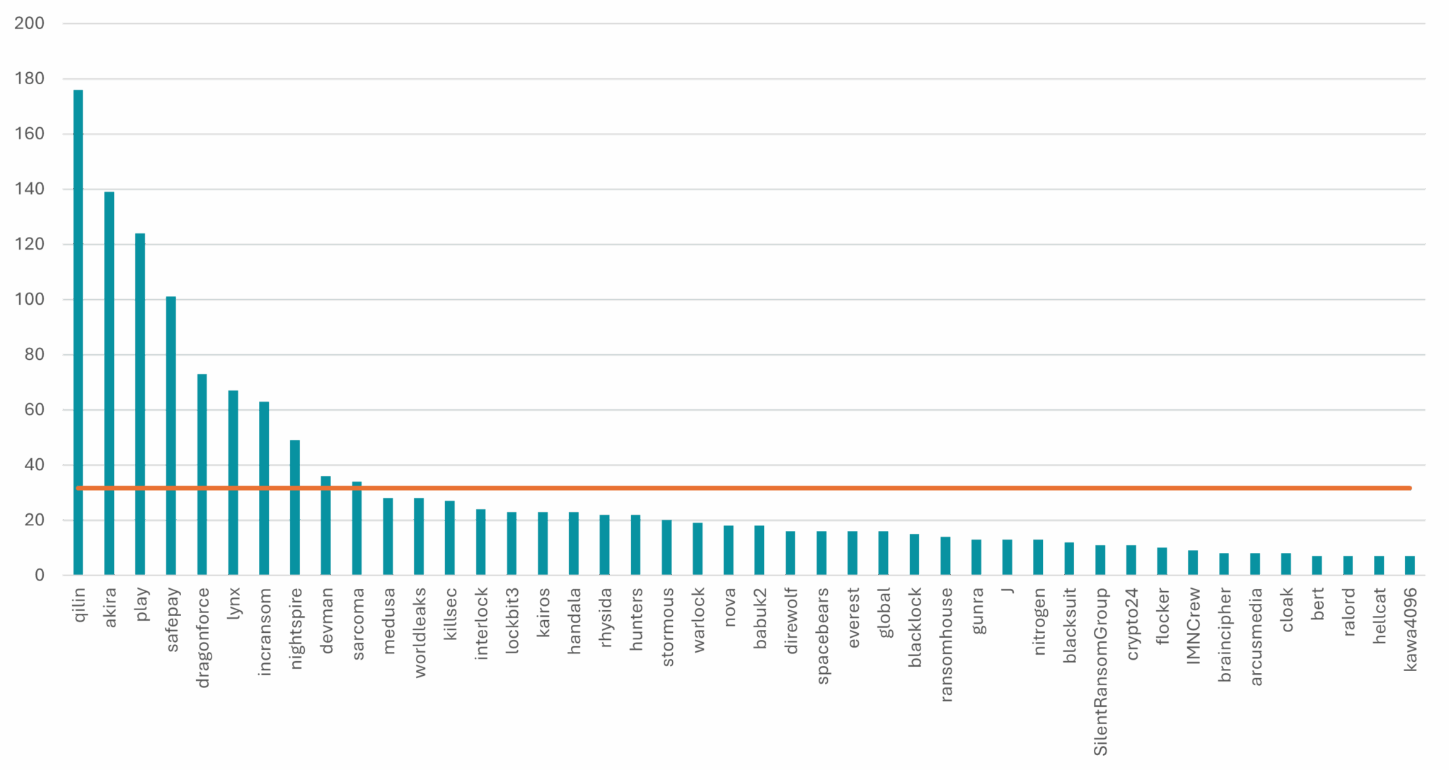With 176 attacks, Qilin has overtaken Cl0p as the most active ransomware group. It is followed by Akira (139 attacks), Play (124 attacks), Safepay (101 attacks), and Dragonforce (73 attacks).