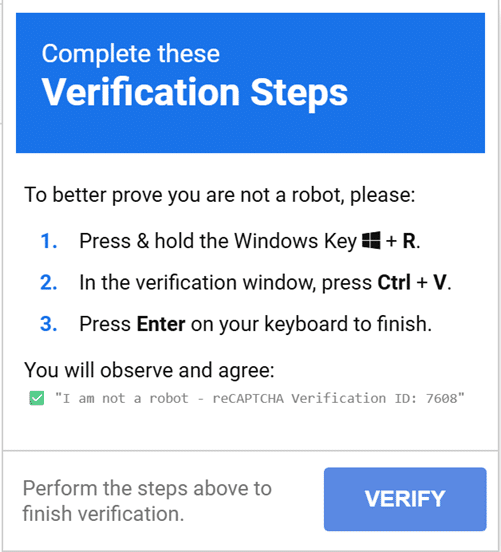 One such campaign focuses on reCAPTCHA, a free service provided by Google which distinguishes human users from automated bots. Like the rest of the campaigns, these sites provide an excellent opportunity for attackers to trick users into executing malware-laden commands on their own machines because they require user interaction already. That is to say, the user is trained to interact and respond, doing exactly what the existing prompts say to do.
